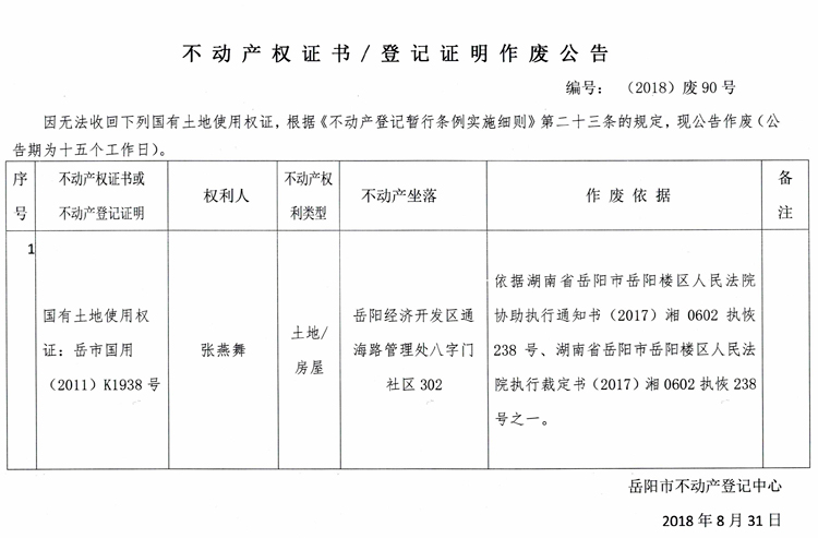 不动产权证书、登记证明作废公告 编号:(2018)废90号