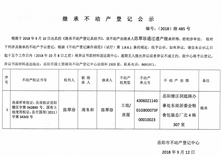继承不动产登记公示 编号:(2018)继485号(陈翠珍)
