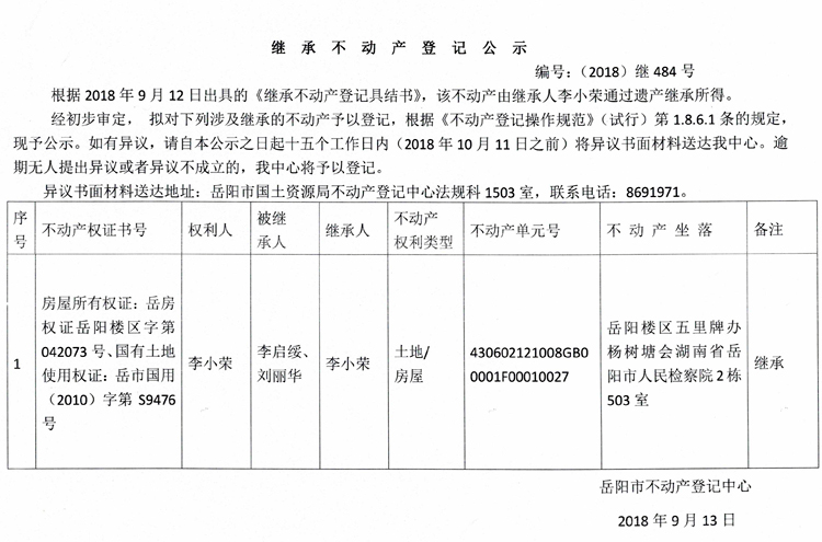 继承不动产登记公示 编号:(2018)继484号(李小荣)
