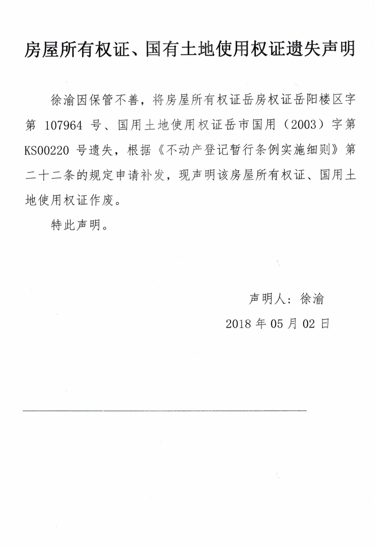 房屋所有权证、国有土地使用权证遗失声明(徐渝)