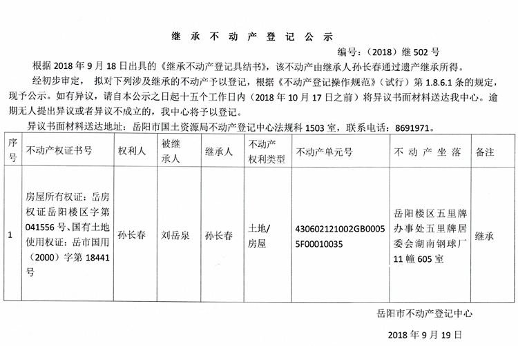 继承不动产登记公示 编号:(2018)继502号
