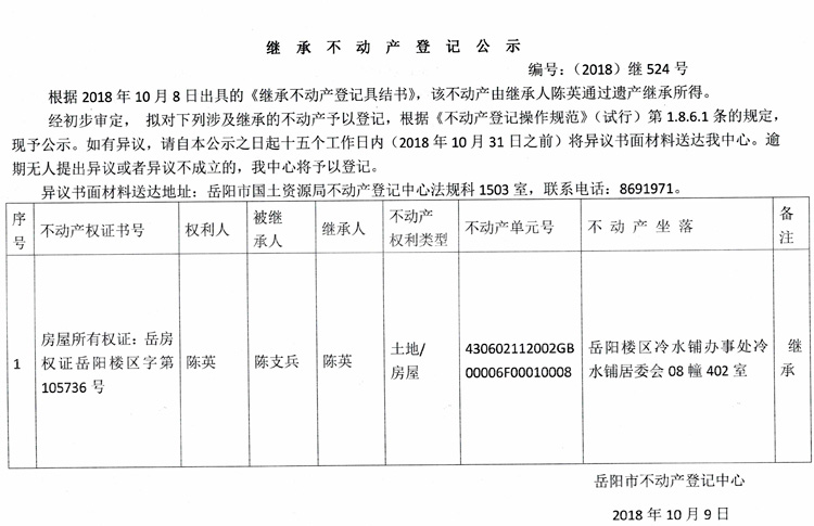 继承不动产登记公示 编号:(2018)继524号