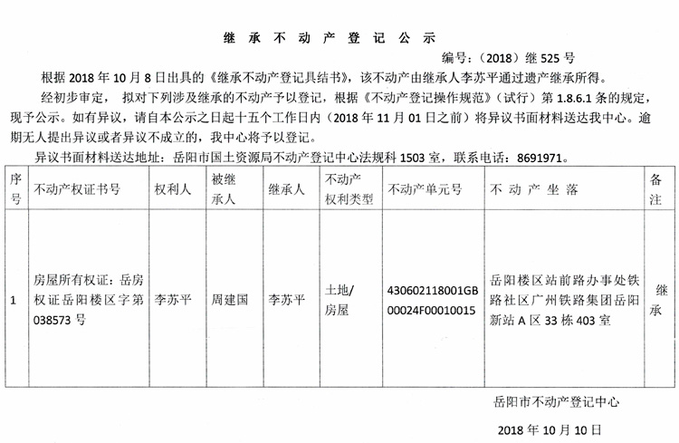 继承不动产登记公示 编号:(2018)继525号