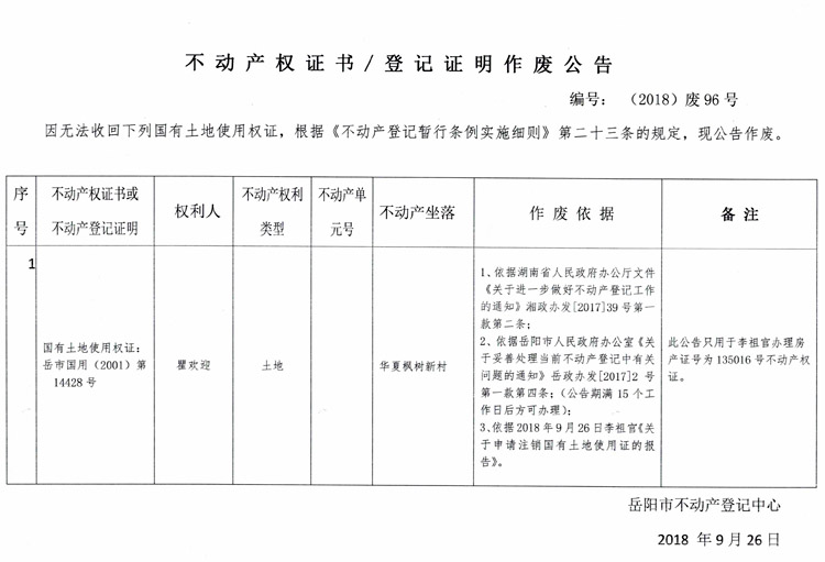 不动产权证书、登记证明作废公告 编号:(2018)废96号