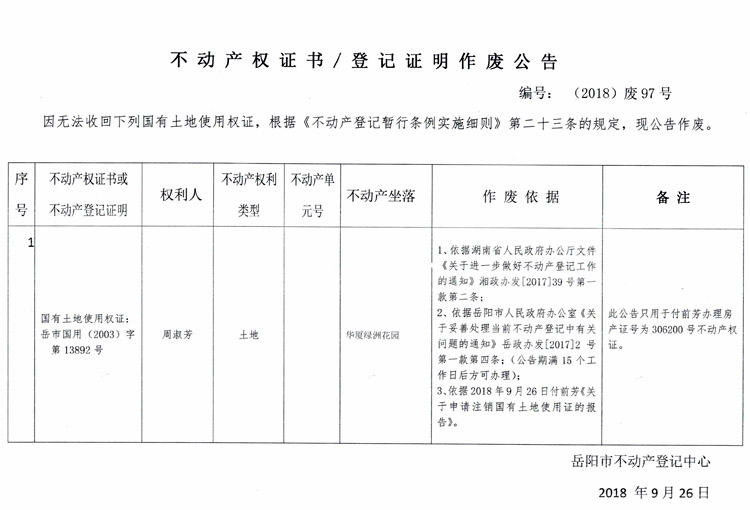 不动产权证书、登记证明作废公告 编号:(2018)废97号