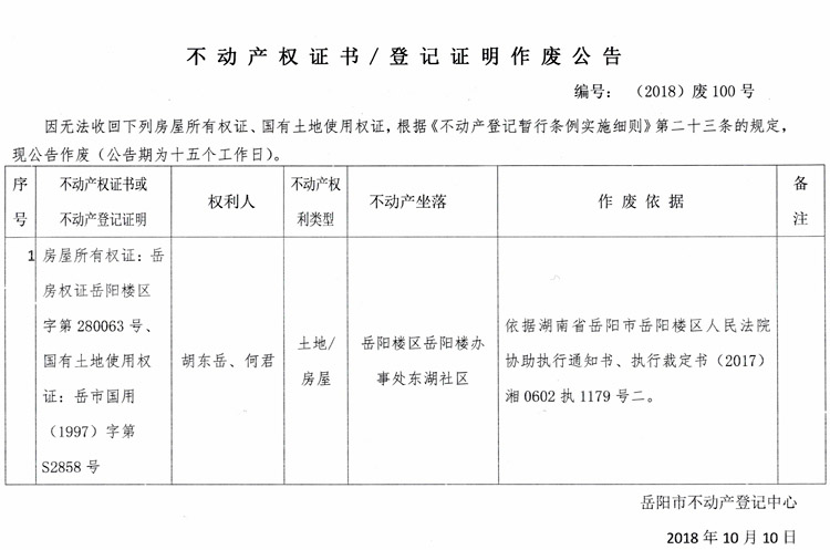 不动产权证书、登记证明作废公告 编号:(2018)废100号