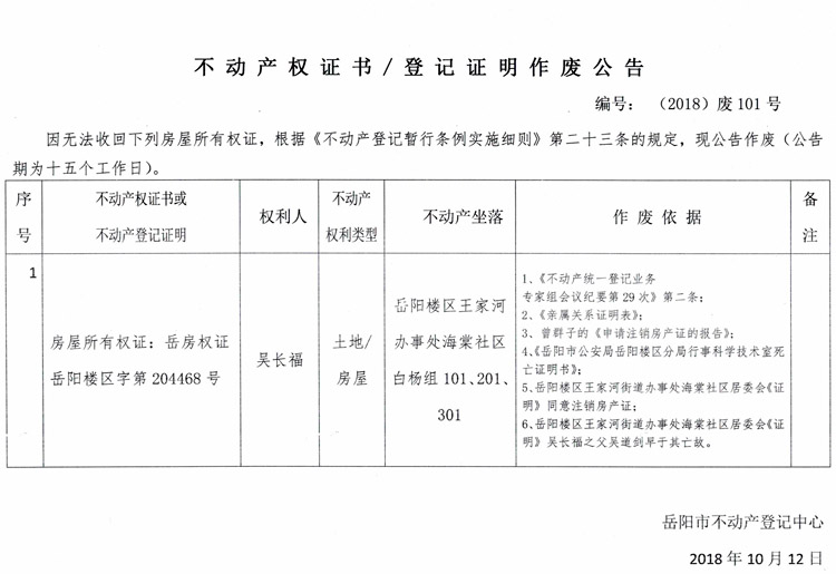 不动产权证书、登记证明作废公告 编号:(2018)废101号