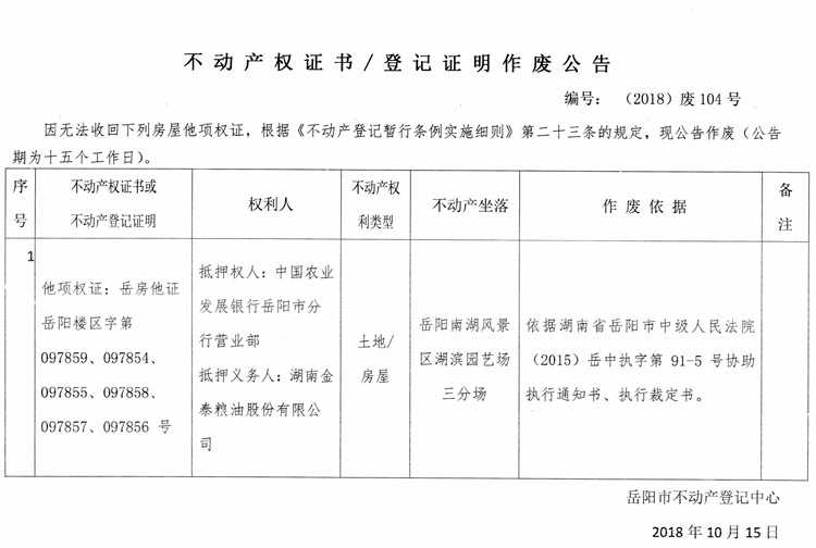不动产权证书、登记证明作废公告 编号:(2018)废104号