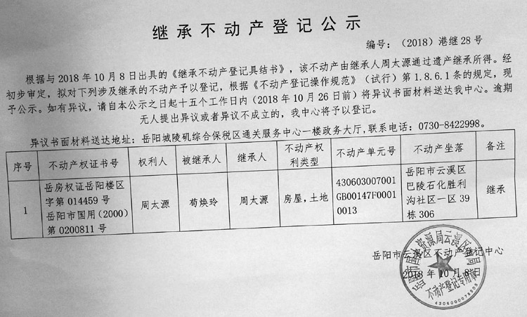 继承不动产登记公示 编号:(2018)港继28号(周太源)