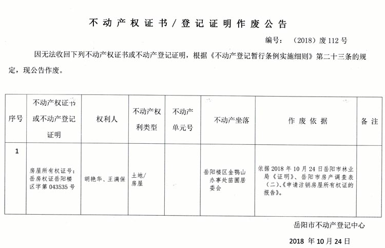不动产权证书、登记证明作废公告 编号:(2018)废112号