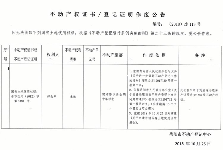 不动产权证书、登记证明作废公告 编号:(2018)废113号