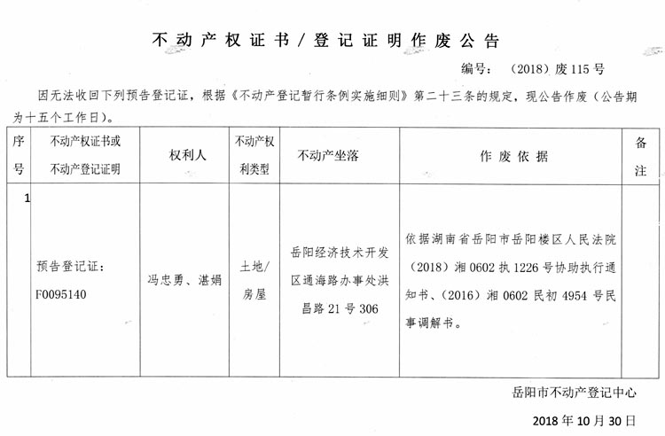 不动产权证书、登记证明作废公告 编号:(2018)废115号