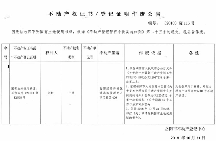 不动产权证书、登记证明作废公告 编号:(2018)废116号