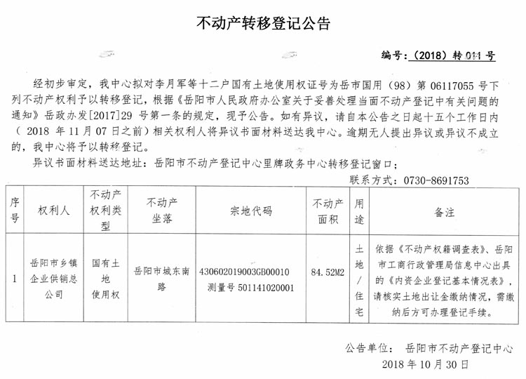 不动产转移登记公告 编号:(2018)转011号