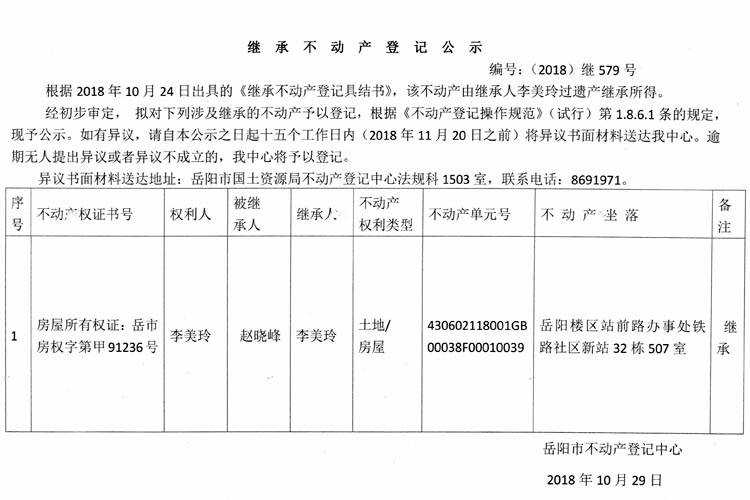 继承不动产登记公示 编号:(2018)继579号