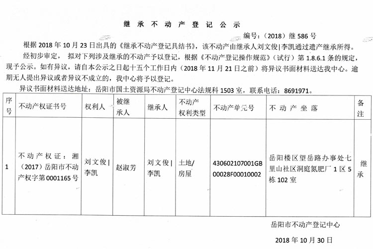 继承不动产登记公示 编号:(2018)继586号(刘文俊)