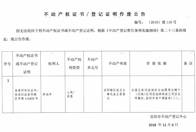 不动产权证书、登记证明作废公告 编号:(2018)废119号