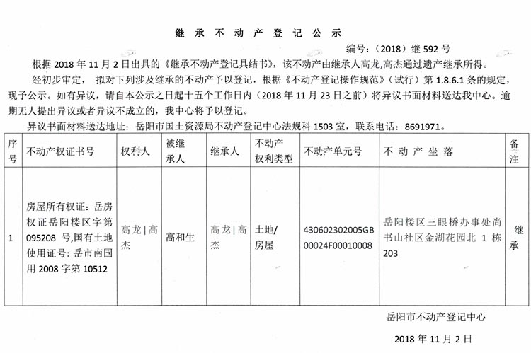 继承不动产登记公示 编号:(2018)继592号(高龙、高杰)