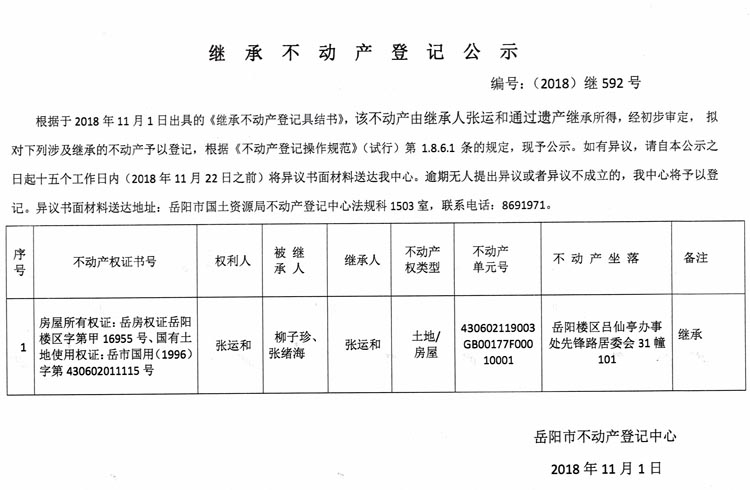 继承不动产登记公示 编号:(2018)继592号(张运和)