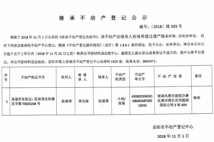 继承不动产登记公示 编号:(2018)继593号(张福秀)