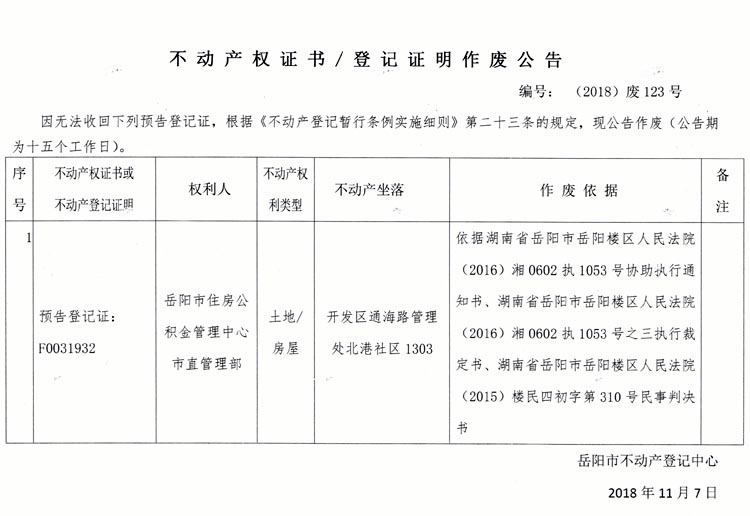 不动产权证书、登记证明作废公告 编号:(2018)废123号