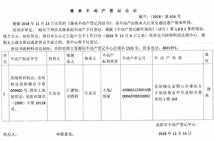 继承不动产登记公示 编号:(2018)继614号