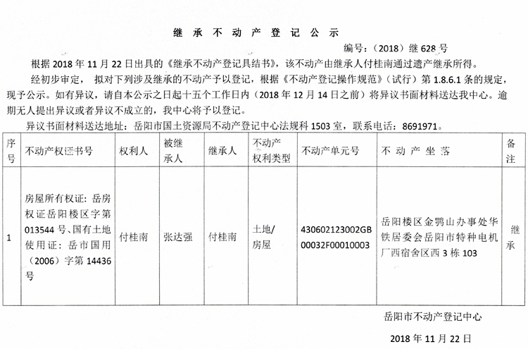 继承不动产登记公示 编号:(2018)继628号
