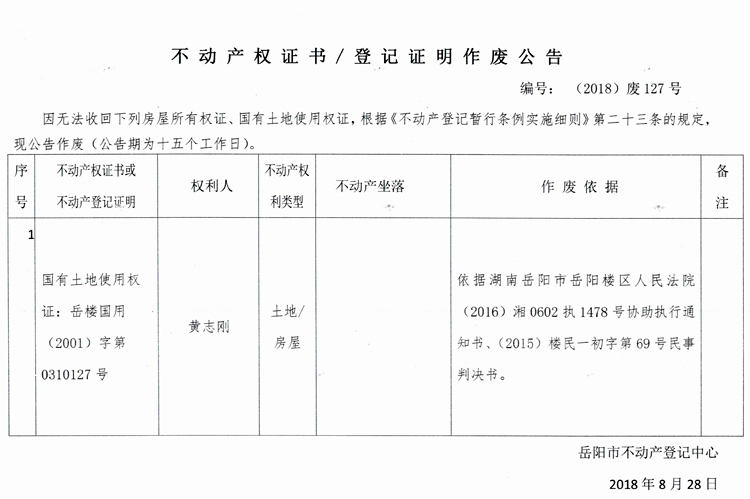 不动产权证书、登记证明作废公告 编号:(2018)废127号