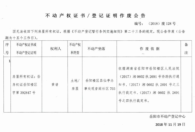 不动产权证书、登记证明作废公告 编号:(2018)废128号