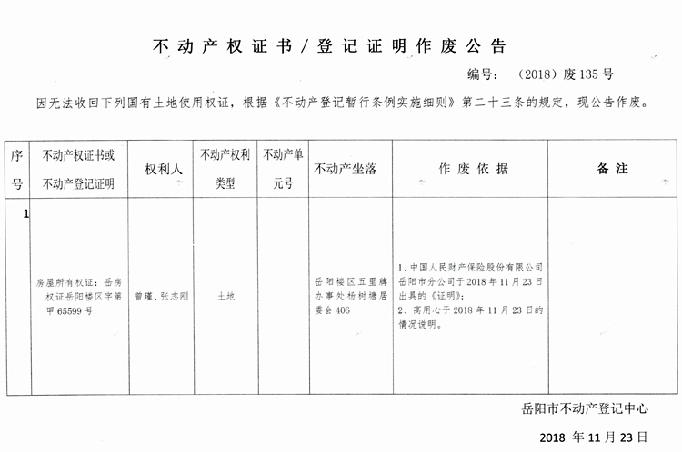 不动产权证书、登记证明作废公告 编号:(2018)废135号