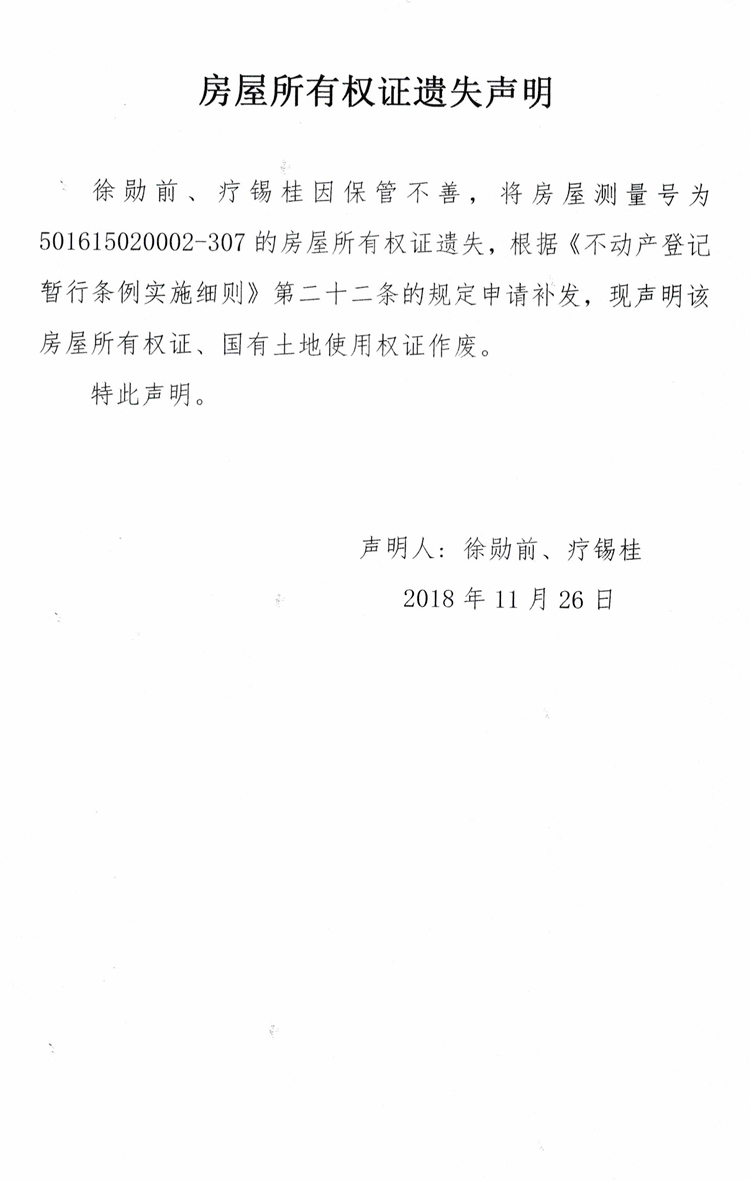 房屋所有权证遗失声明(徐勋前、疗锡桂)