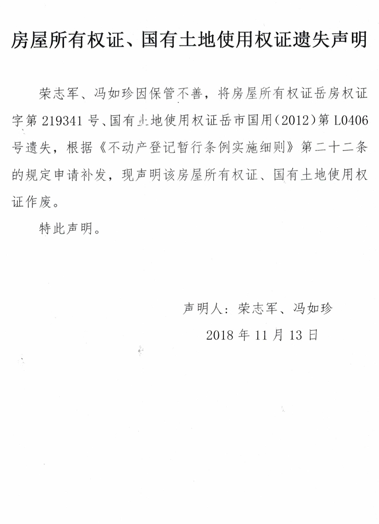房屋所有权证、国有土地使用权证遗失声明(荣志军、冯如珍)