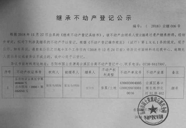 继承不动产登记公示 编号:(2018)云继006号