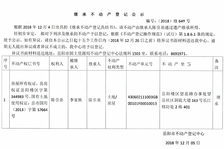 继承不动产登记公示 编号:(2018)继649号