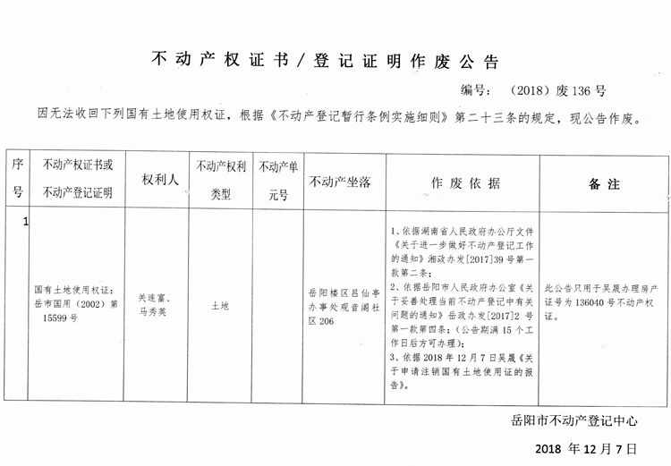 不动产权证书、登记证明作废公告 编号:(2018)废136号