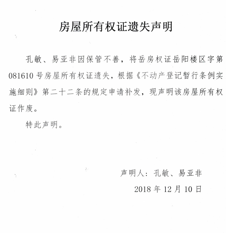 房屋所有权证遗失声明(孔敏、易亚非)