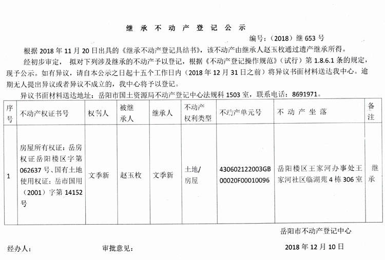 继承不动产登记公示 编号:(2018)继653号