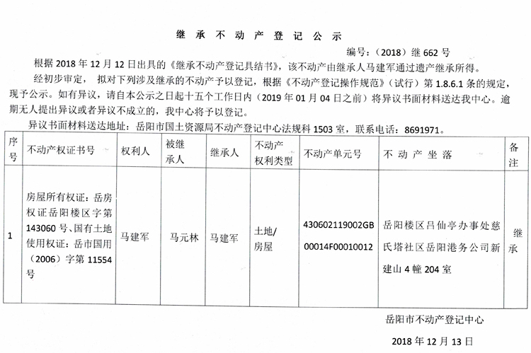 继承不动产登记公示 编号:(2018)继662号