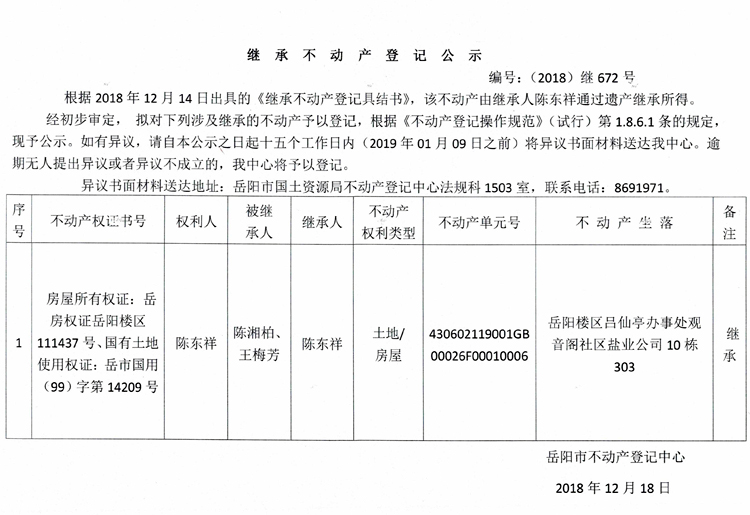 继承不动产登记公示 编号:(2018)继672号