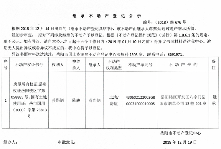 继承不动产登记公示 编号:(2018)继676号