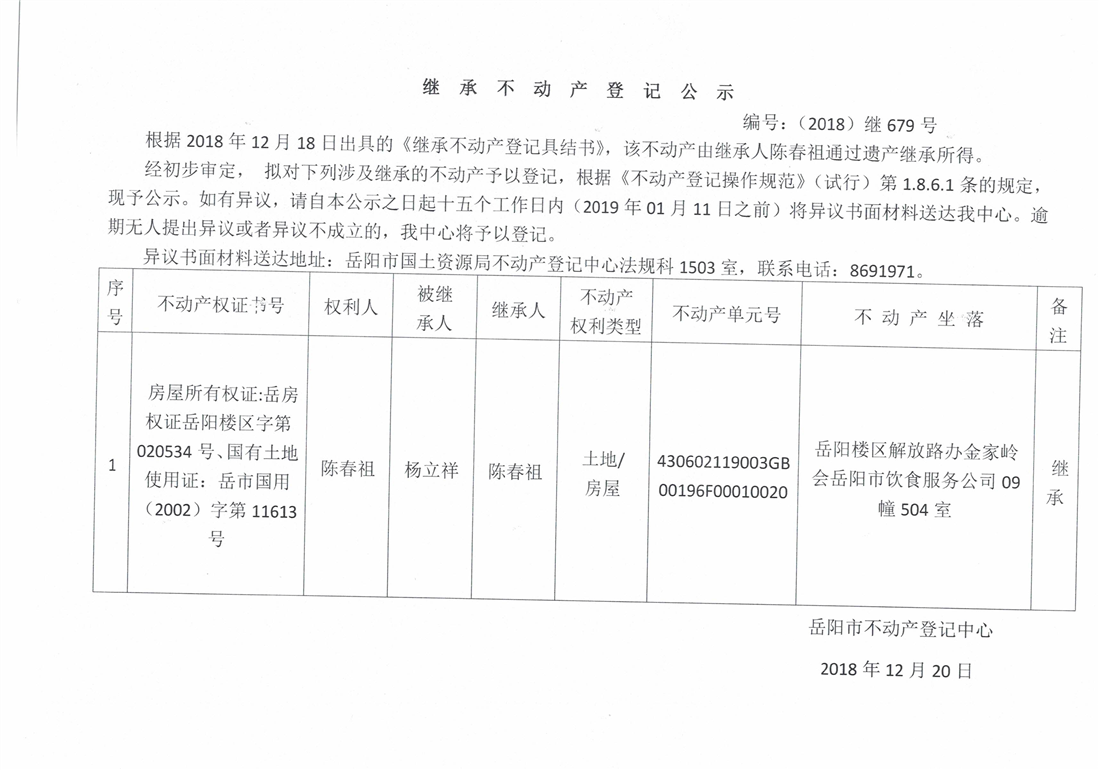 继承不动产登记公示 编号:(2018)继号679号(陈春祖)