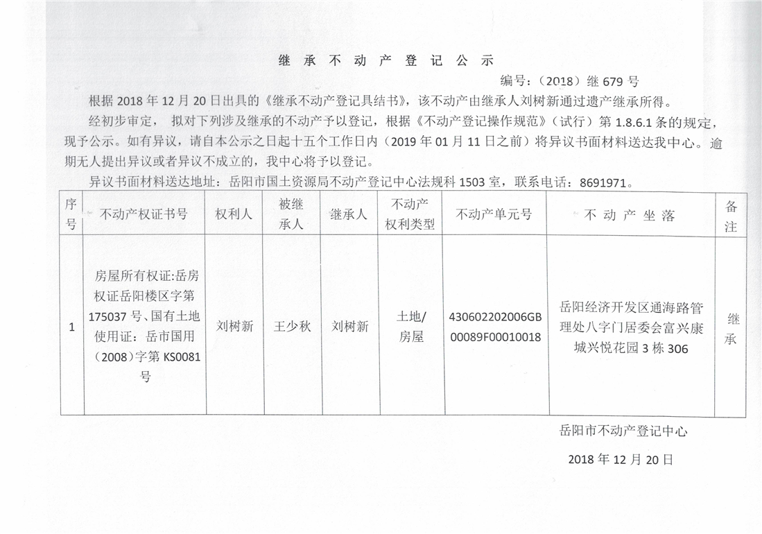 继承不动产登记公示 编号:(2018)继号679号(刘树新)