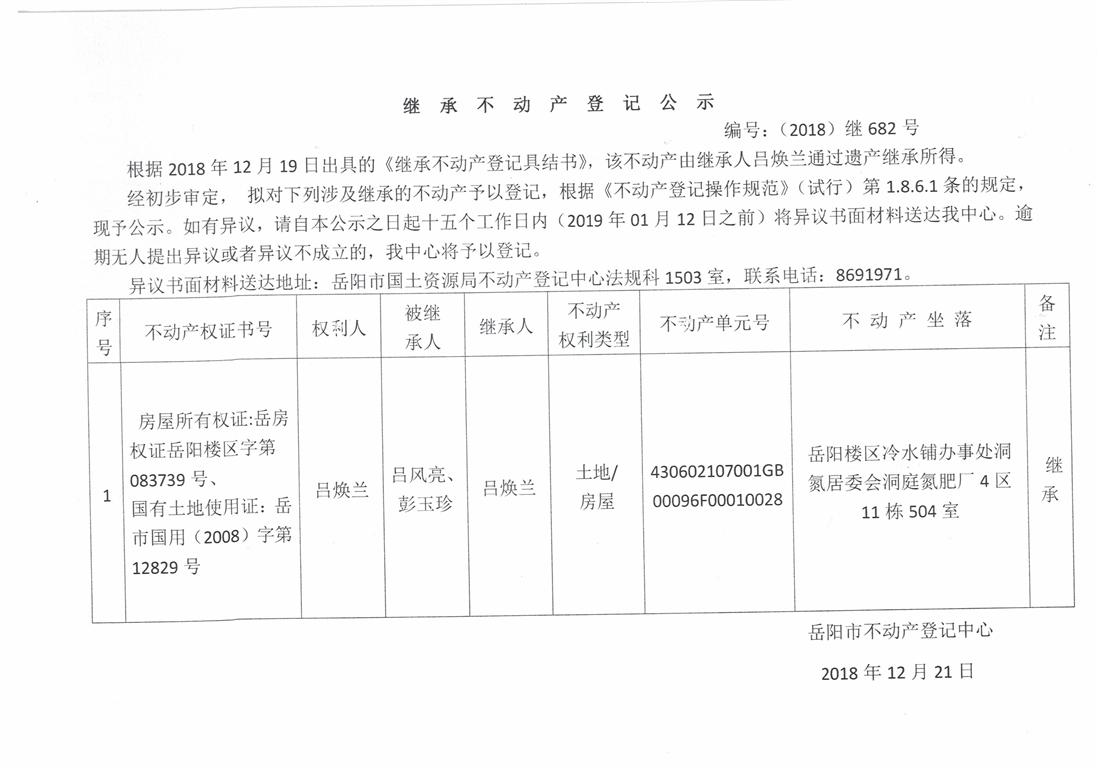 继承不动产登记公示 编号:(2018)继号682号