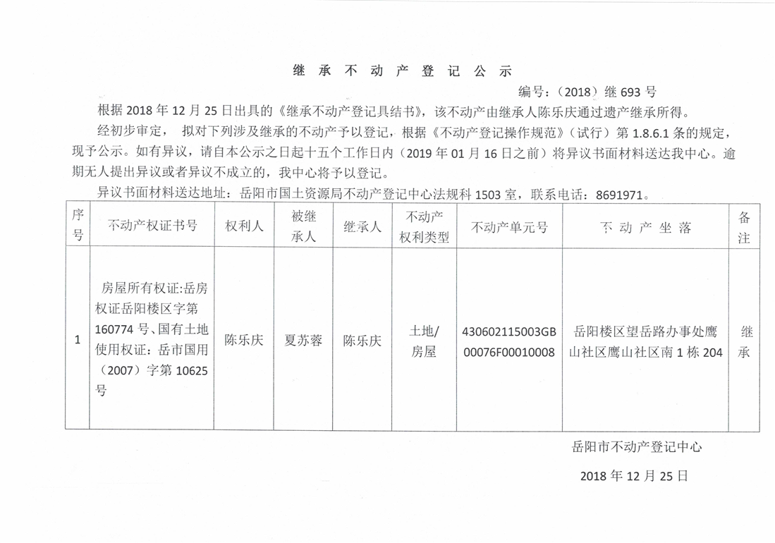 继承不动产登记公示 编号:(2018)继号693号
