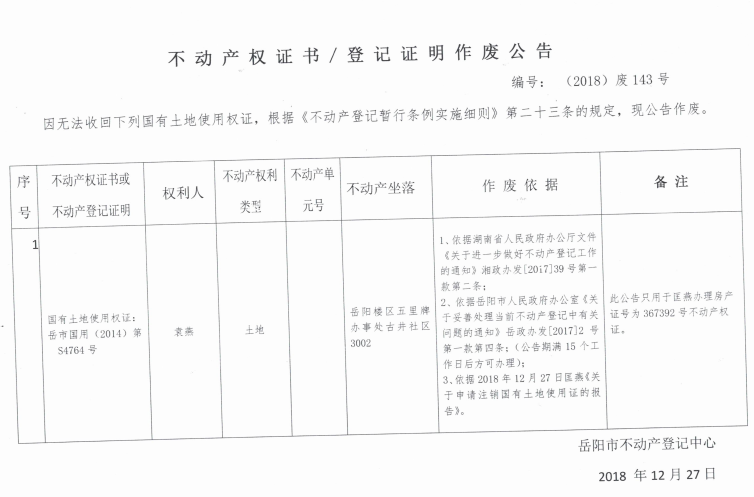 不动产权证书、登记证明作废公告 编号: (2018)废143号