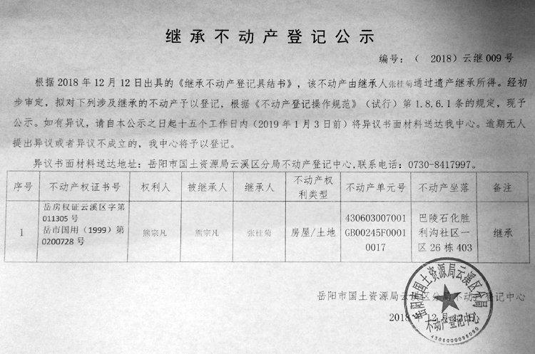 继承不动产登记公示 编号:(2018)云继009号