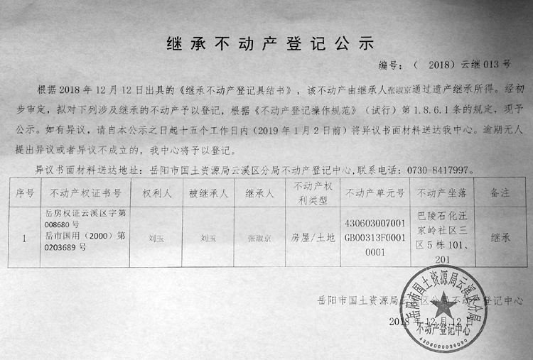 继承不动产登记公示 编号:(2018)云继013号