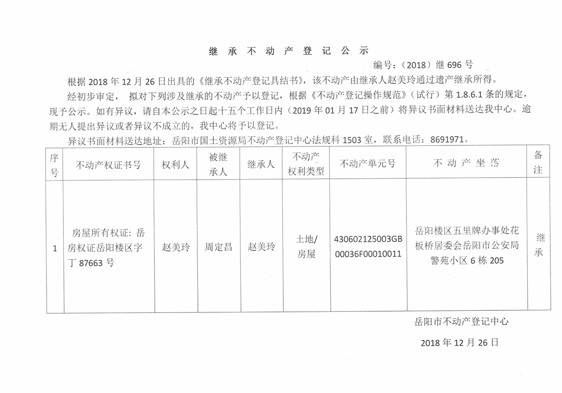 继承不动产登记公示 编号:(2018)继号696号