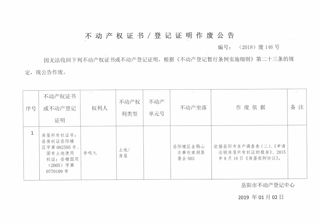 不动产权证书、登记证明作废公告 编号:(2018)废146号