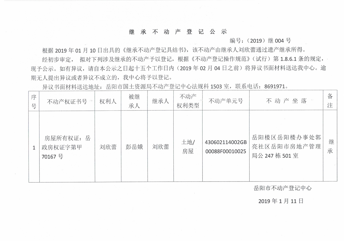 继承不动产登记公示 编号:(2019)继号004号